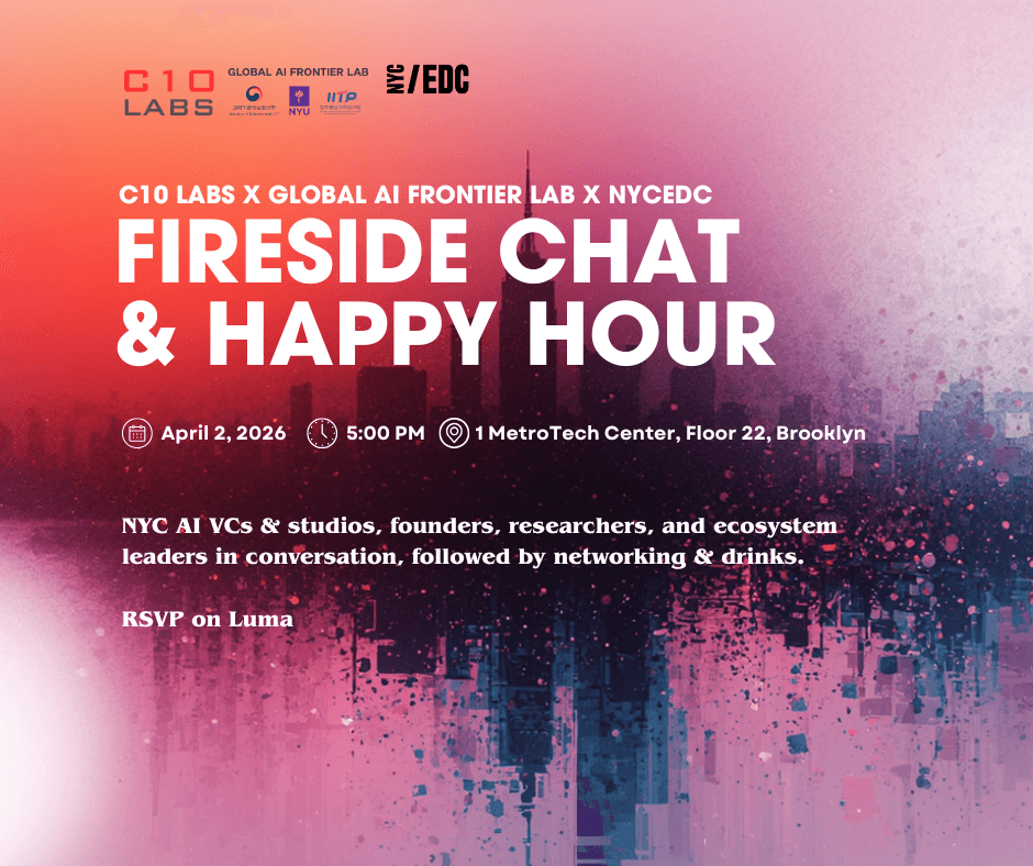 Join C10 Labs (AI fund & studio), the NYU Global AI Frontier Lab, and NYCEDC for an evening fireside chat and happy hour bringing together founders, researchers, operators, students, and ecosystem leaders from across New York’s AI community.