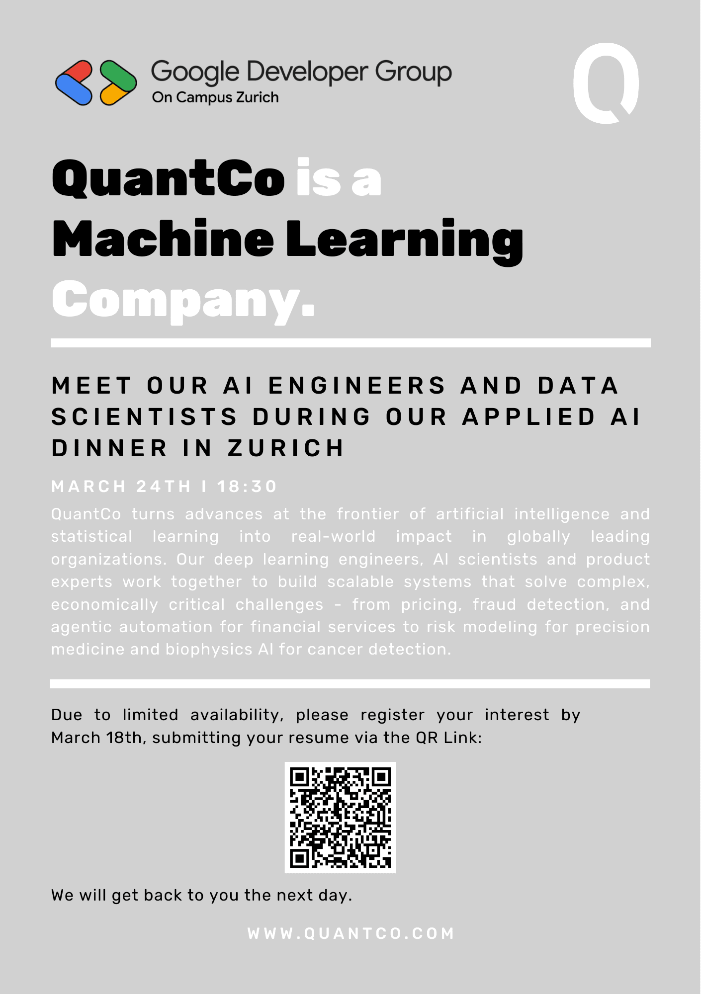Join GDG on Campus Zurich and QuantCo for an exclusive dinner at one of Zurich’s top restaurants.No slides, no lecture halls, just high-level conversations about AI, Deep Learning, and Software Engineering. Meet the experts building scalable systems for everything from fraud detection to cancer research while enjoying a world-class meal. 🧠✨🗓️ March 23 @ 18:30 📍 Top-secret Zurich location (revealed upon confirmation) 🚀 In collaboration with QuantCoSpots are strictly limited.