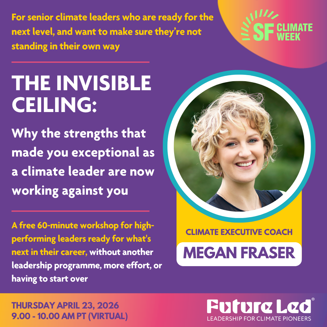 The Invisible Ceiling: Why the qualities that made you exceptional as a climate leader are now working against you (SFCW) is a free independent taking place on Thursday, April 23, 2026 at a venue to be announced. This independent is organised by Future Led. Attendance is free — register to secure your spot. Currently 17 people have registered out of 17 spots. The event runs for approximately 1 hour.