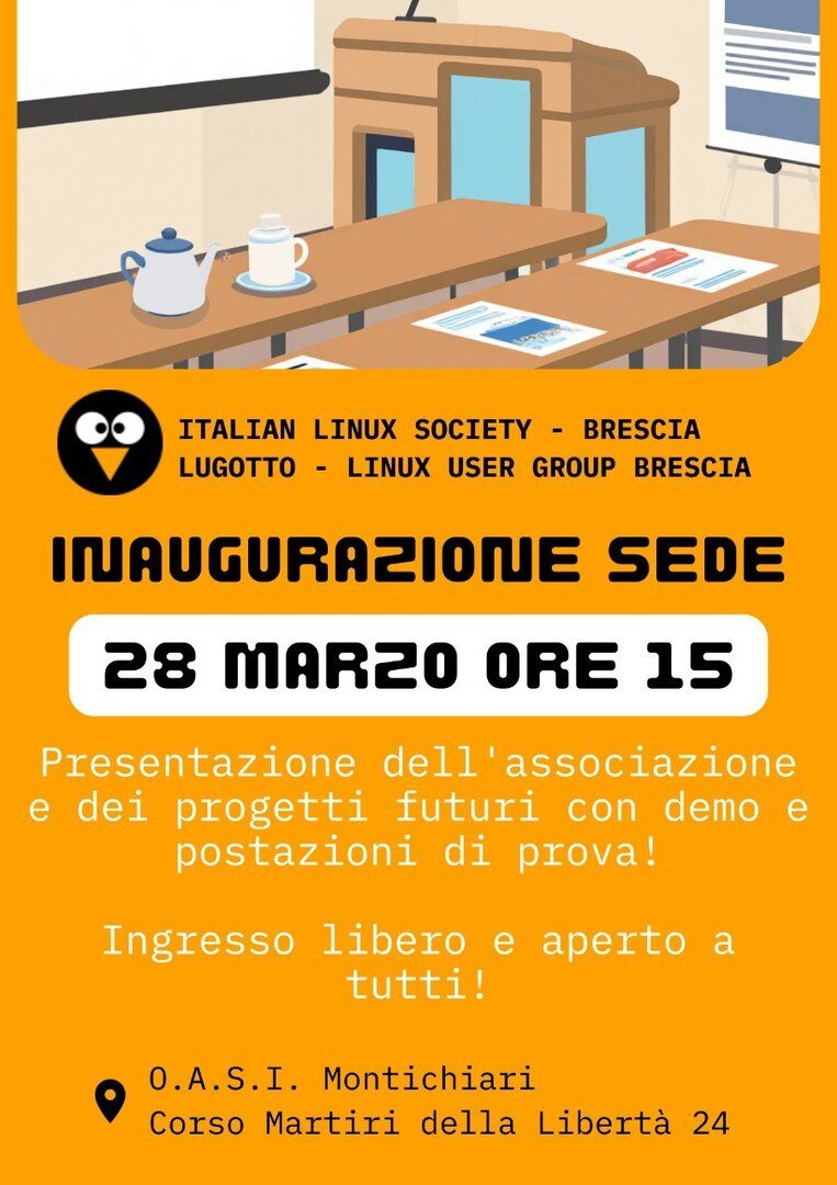 Presso la sede del Lugotto e di ILS Bresciaall’O.A.S.I. di Montichiariin Corso Martiri della Libertà, 24Si terrà l’inaugurazione ufficiale della sede del Lugotto e di Italian Linux Society sezione Brescia.Presentazione al pubblico delle associazioni ILS Brescia e Lugotto:Scopo delle associazioni.Stazioni demo con installazioni di distribuzioni Linux e di Software Libero.Possibilità di conoscere i volontari.Attività e programmi futuri.Ingresso libero e aperto a tutti!