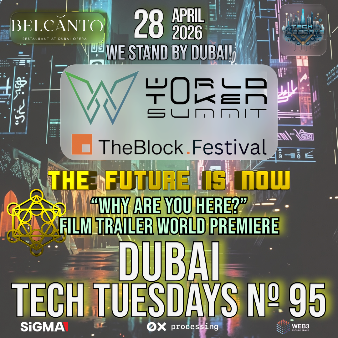 Dubai Tech Tuesdays No. 95 - World Token Summit Dubai x TheBlock.Festival + TFIN "Why Are You Here?" Film Trailer Premiere is a free independent taking place on Tuesday, April 28, 2026 at Belcanto Restaurant at Dubai Opera, Sheikh Mohammed bin Rashid Blvd - Burj Khalifa - Downtown Dubai - Dubai - United Arab Emirates, Dubai, United Arab Emirates. This independent is organised by Tech Tuesdays. Attendance is free — register to secure your spot. Currently 52 people have registered out of 52 spots. The event runs for approximately 5 hours and 30 minutes.