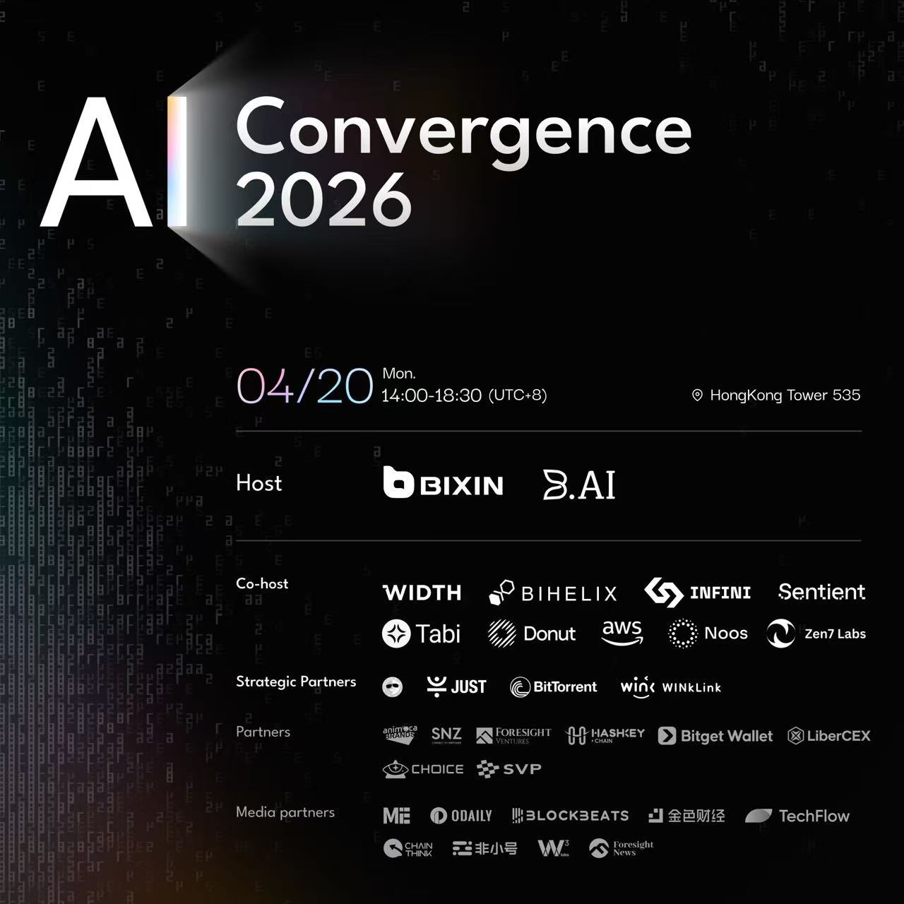 AI & Web3 Convergence 2026 is a free independent taking place on Monday, April 20, 2026 at TOWER 535, 535 Jaffe Rd, Causeway Bay, Hong Kong, Hong Kong Island, Hong Kong. Attendance is free — register to secure your spot. Currently 442 people have registered out of 442 spots. The event runs for approximately 5 hours.