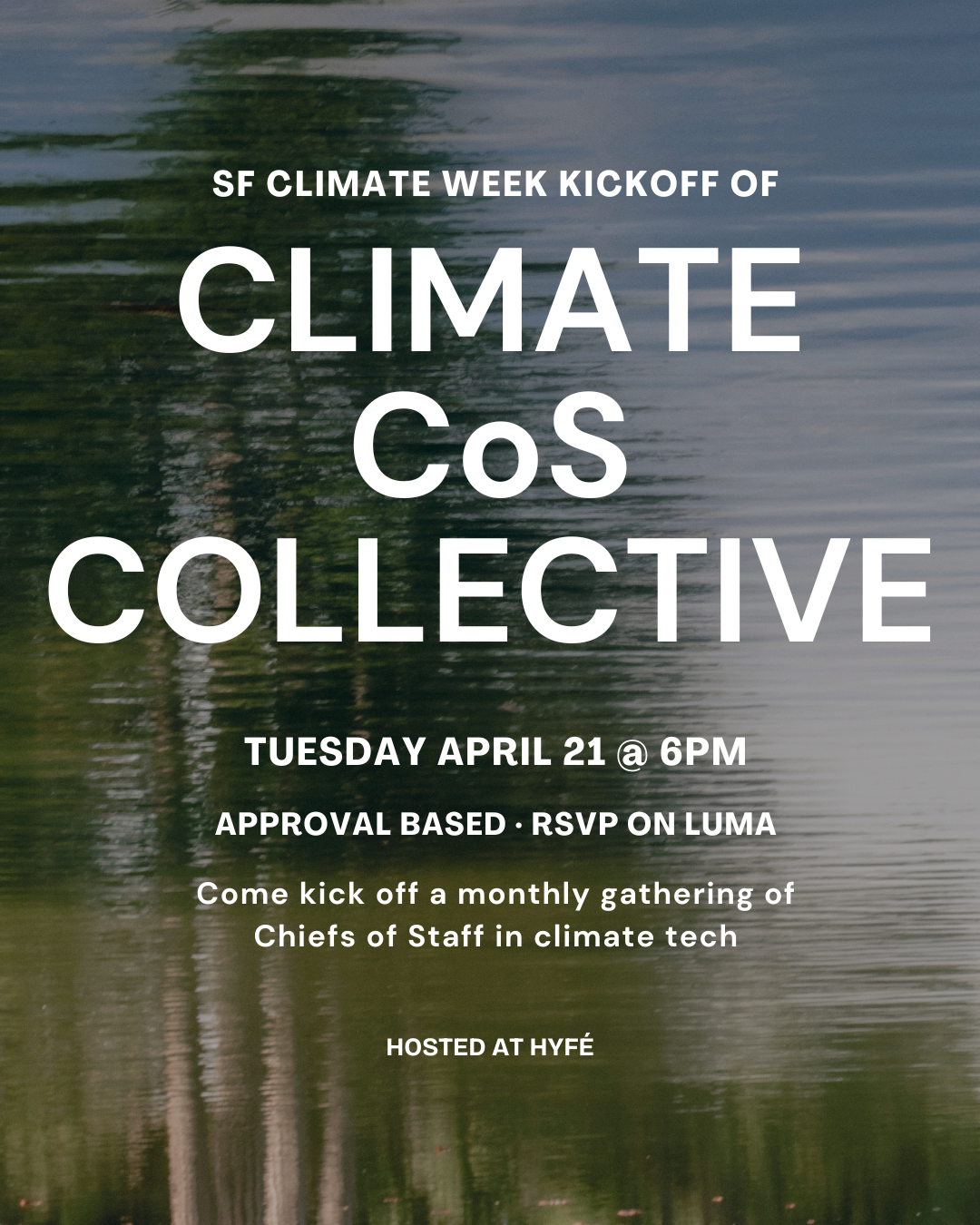 This is the first event of an ongoing series. We're bringing together a small, curated group of CoS from across the climate tech ecosystem for drinks and a facilitated conversation hosted at the Hyfé facility in the Mission. If you're a CoS in climate, this community is being built for you — come be part of it from the start.