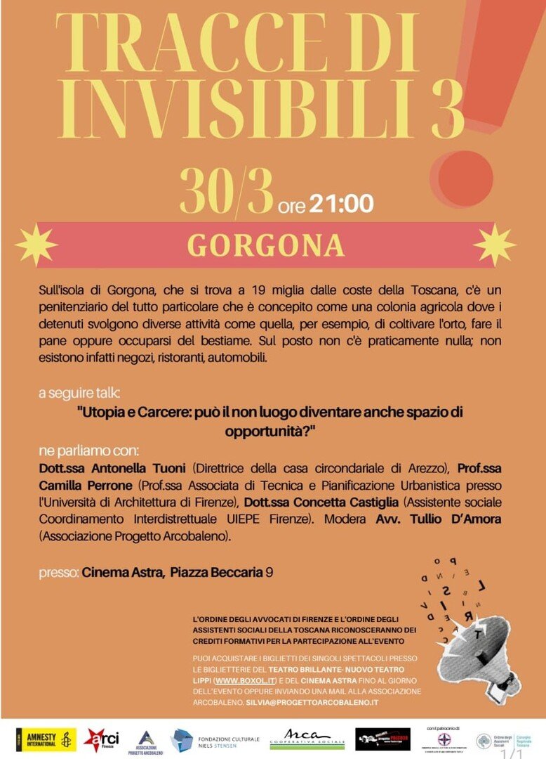 Nuovi appuntamenti della rassegna Tracce di Invisibili - Lunedì 30 marzo 2026, ore 21:00 - Cinema Astra, Piazza Beccaria 9 - Firenze. Film "Gorgona" di Antonio Tibaldi (Italia 2022, 91'). Sull'isola di Gorgona, che si trova a 19 miglia dalla Toscana, esiste un carcere del tutto particolare che è concepito come una colonia agricola, dove i detenuti svolgono diverse attività, come per esempio quella di coltivare l'orto di fare il pane, oppure occuparsi del bestiame. Sul posto non c'è praticamente nulla; non esistono infatti negozi, ristoranti, automobili. A seguire talk: "Utopia e carcere: può il non luogo diventare anche spazio di opportunità?"* Ne parliamo con: Antonella Tuoni (direttrice della casa circondariale di Arezzo); Camilla Perrone (Prof.ssa Associata di Tecnica e Pianificazione Urbanistica della Università di Architettura di Firenze) Concetta Castiglia (Assistente Sociale Coordinamento Interdistrettuale UIEPE Firenze). Modera l'avv. Tullio D'Amora ( Associazione Progetto Arcobaleno) Biglietti: https://www.boxol.it e Cinema Astra 𝐓𝐫𝐚𝐜𝐜𝐞 𝐝𝐢 𝐈𝐧𝐯𝐢𝐬𝐢𝐛𝐢𝐥𝐢 è la rassegna teatrale e cinematografica dedicata ai diritti umani a cura di Arci Firenze, Amnesty International - Firenze, Gruppo giovani Amnesty Firenze, Associazione Progetto Arcobaleno, Fondazione Stensen, Blanca Teatro con il sostegno dell'Ordine degli Avvocati di Firenze e dell'Ordine degli Assistenti Sociali toscano. Informazioni su ArciFirenze.it / 333 4995033 / info@blancateatro.it