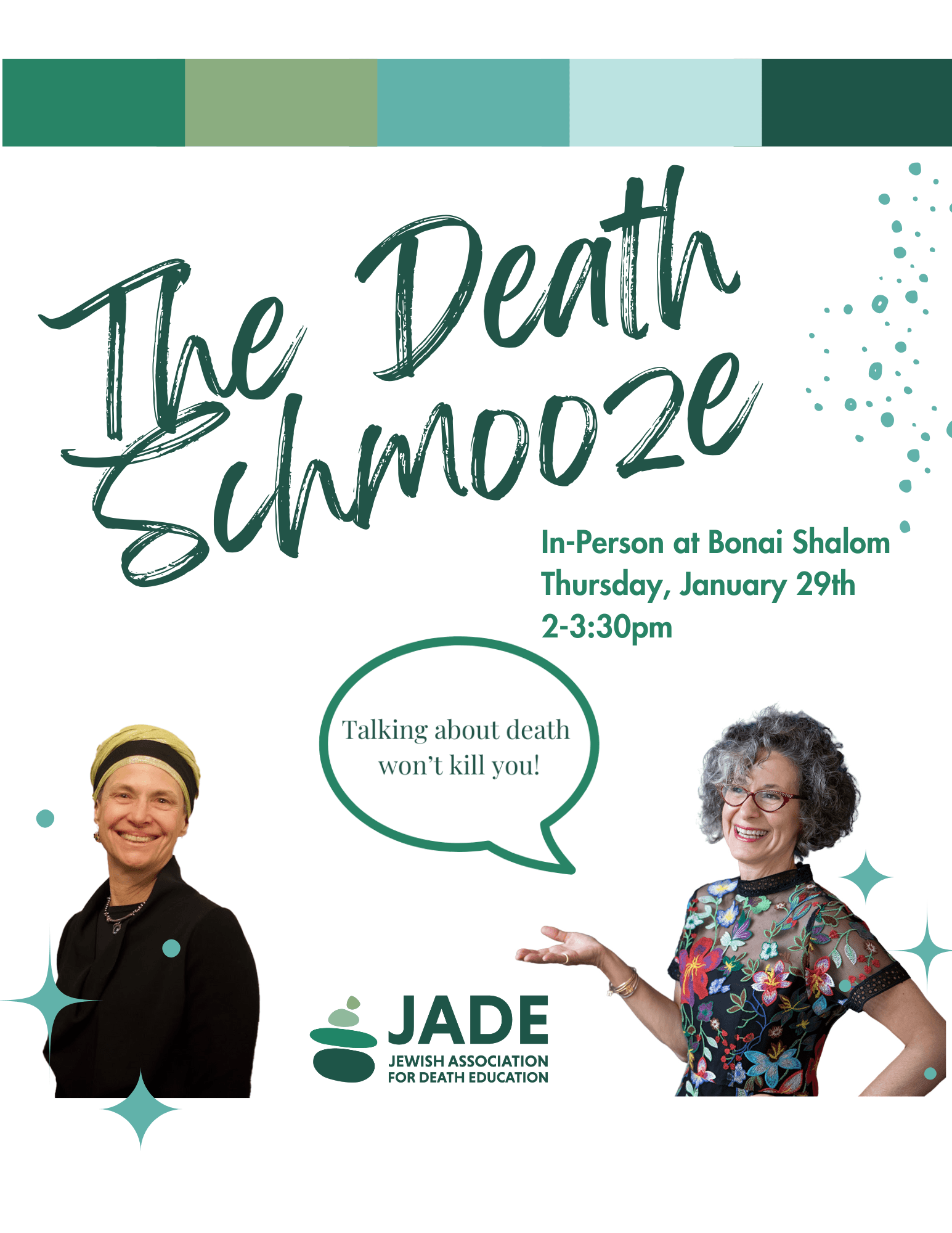 Our first monthly (quarterly?) In-Person Boulder Death Schmooze (Death Cafe), where we talk about all things death. This is a space for anyone to feel welcome. Share your grief stories, your struggles, your moments of beauty or spirituality, and bring questions about this inevitable lifecycle event. Beverages and snacks will be available. Facilitated by Evie Cohen and Sue Mackey.