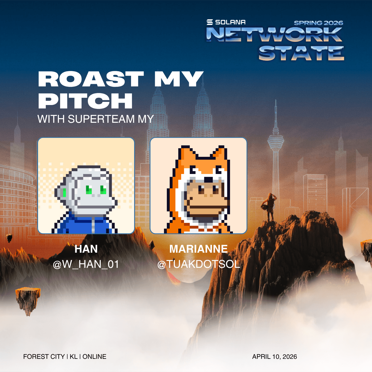 Every week at Solana Network State Spring '26, we put founders in the hot seat. Two minutes to pitch your project, then our guest judges - Joey from the NS Core team, and two more guest judges to be announced - tear it apart, across problem framing, solution clarity, go-to-market, and everything else that will get you cut in the first round of Colosseum judging.