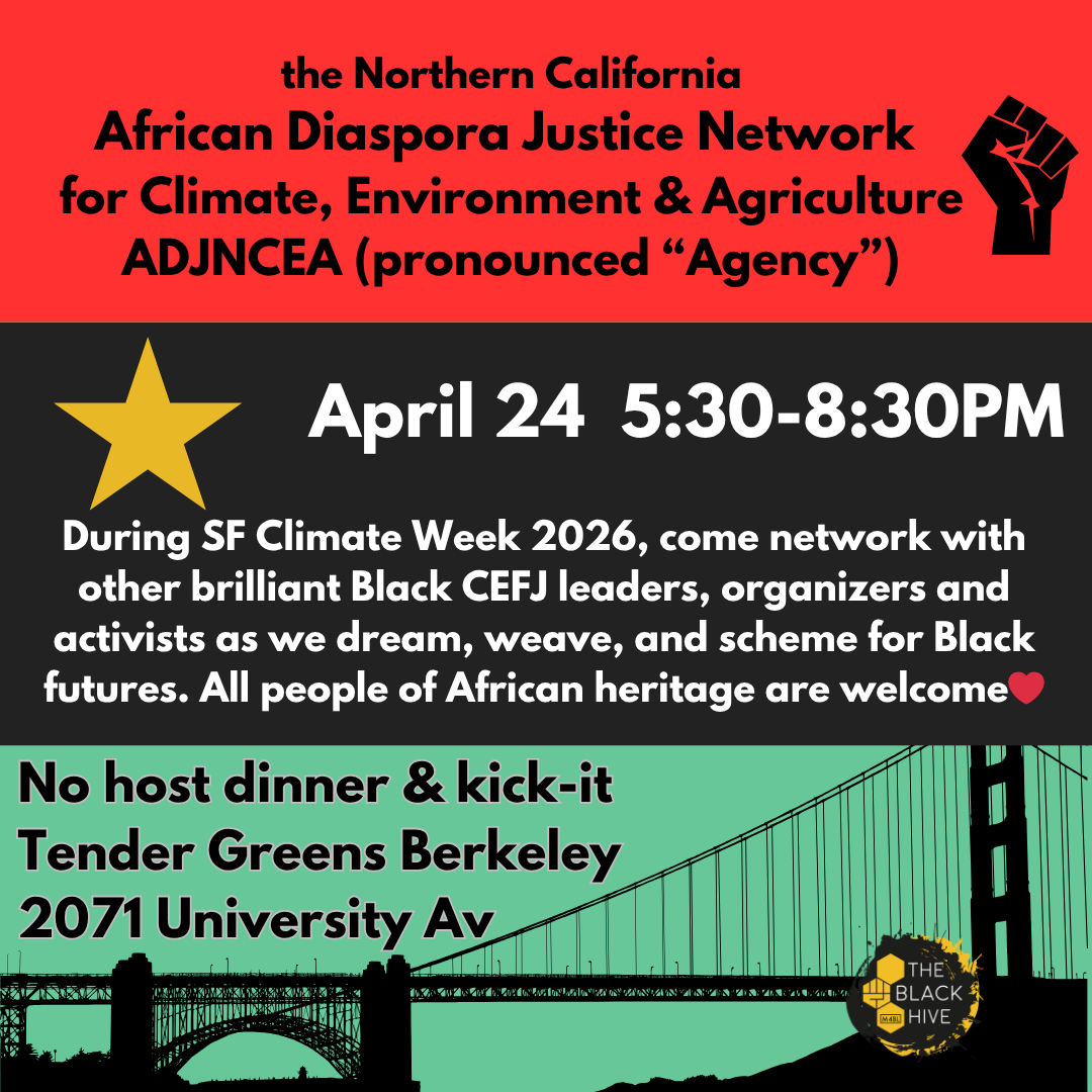The Northern California African Diaspora Justice Network for Climate, Environment & Agriculture ADJNCEA (pronounced βAgencyβ) is a space for Black folks in NorCal who do this work to break isolation, escape silos, and develop strategic connections. A no-host food and drink event.