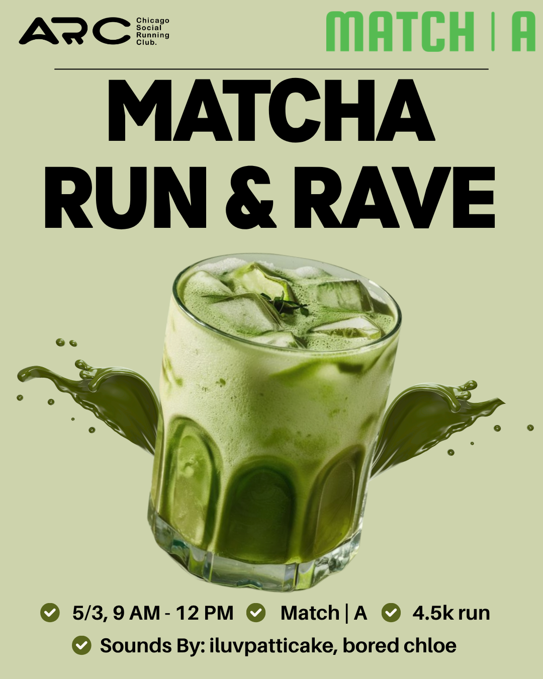Matcha Run & Rave - ARC x Match | A is a free independent taking place on Sunday, May 3, 2026 at Match | A, 1857 W Chicago Ave Front Store, Chicago, IL 60622, USA, Chicago, United States. Attendance is free โ register to secure your spot. Currently 43 people have registered out of 43 spots. The event runs for approximately 3 hours.