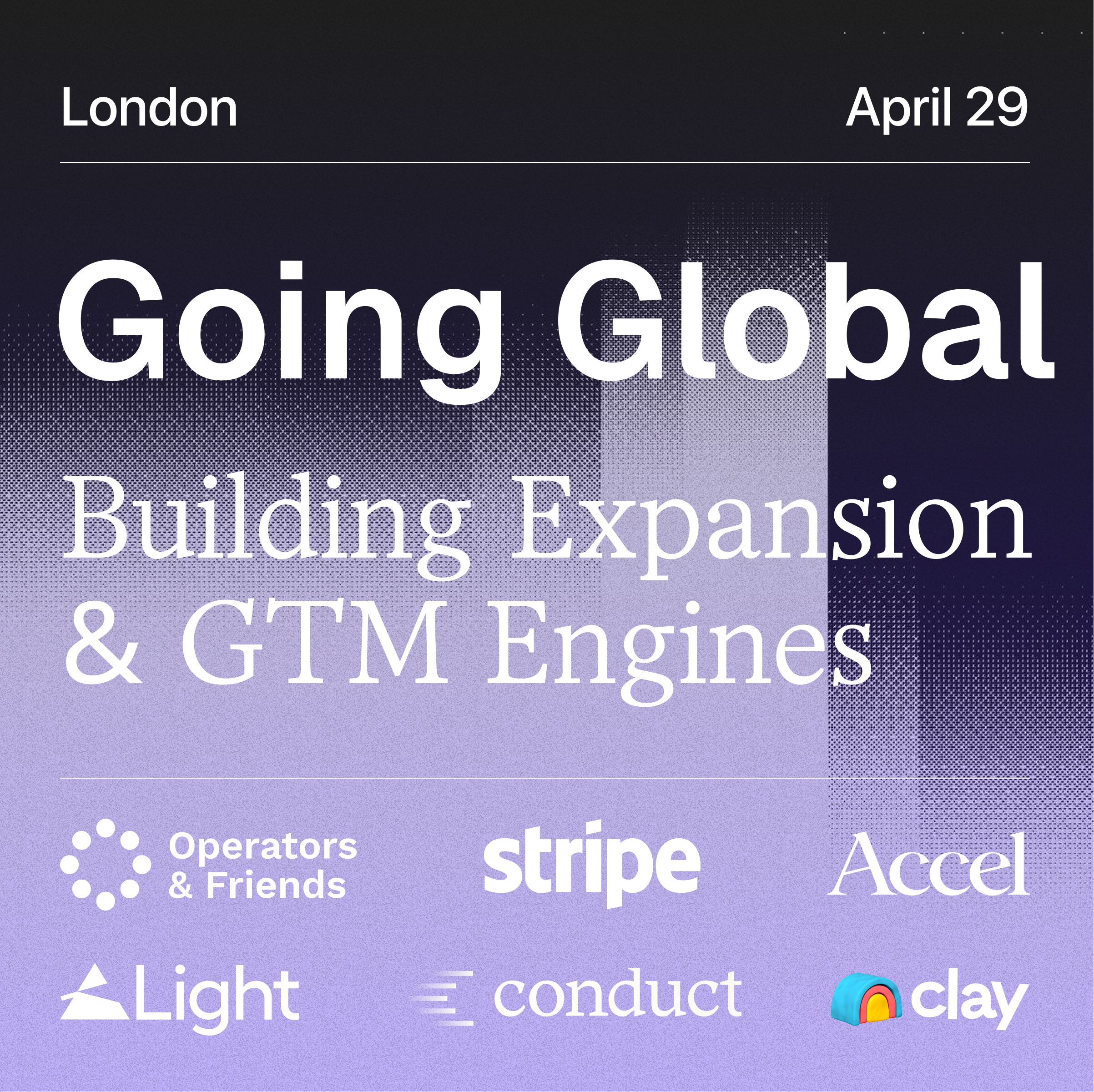 Going Global - Building Expansion & GTM Engines is a free independent taking place on Wednesday, April 29, 2026 at London. This independent is organised by Operators & Friends. Attendance is free โ register to secure your spot. The event runs for approximately 3 hours.