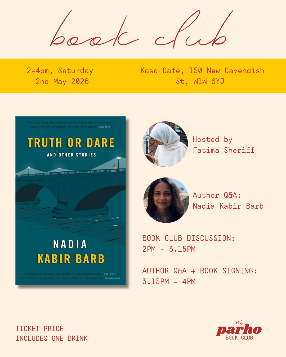 BOOK CLUB: Truth or Dare by Nadia Kabir Barb is a independent taking place on Saturday, May 2, 2026 at Kasa Cafe London, 150 New Cavendish St, London W1W 6YJ, UK, London, United Kingdom. This event is check the event page for pricing details. The event runs for approximately 2 hours.