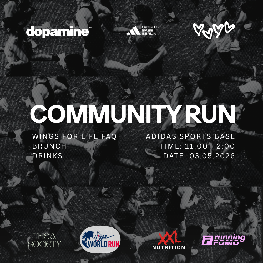 WINGS FOR LIFE FAQ COMMUNITY EVENT is a free independent taking place on Sunday, May 3, 2026 at adidas SPORTS BASE BERLIN, Schleusenufer 4, 10997 Berlin, Germany, Berlin, Germany. Attendance is free โ register to secure your spot. Currently 104 people have registered out of 104 spots. The event runs for approximately 3 hours.