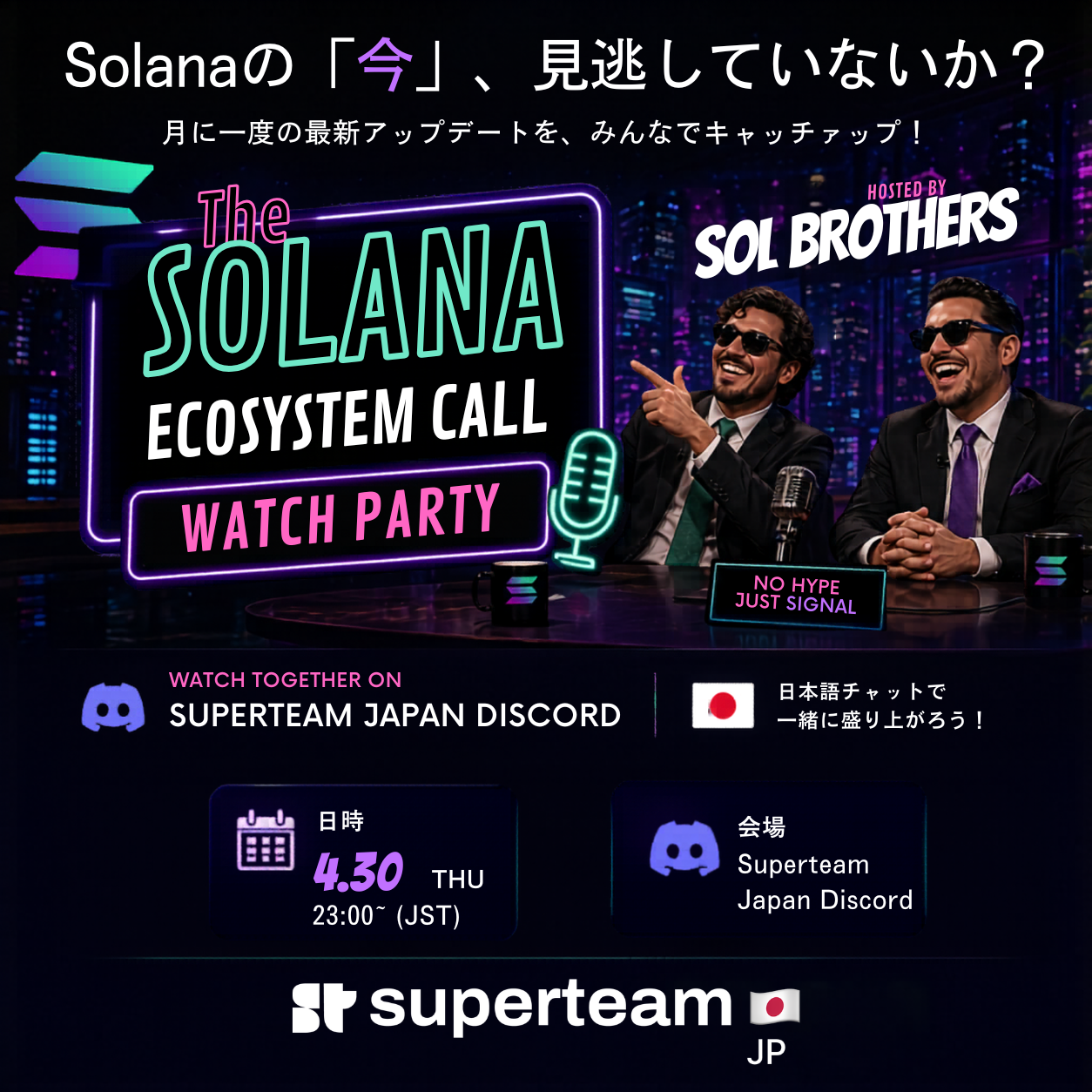 本配信を、Superteam JapanコミュニティのDiscordでみんなで同時視聴。チャットで盛り上がりながら、見逃しがちな最新トピックを一緒にキャッチアップしましょう。