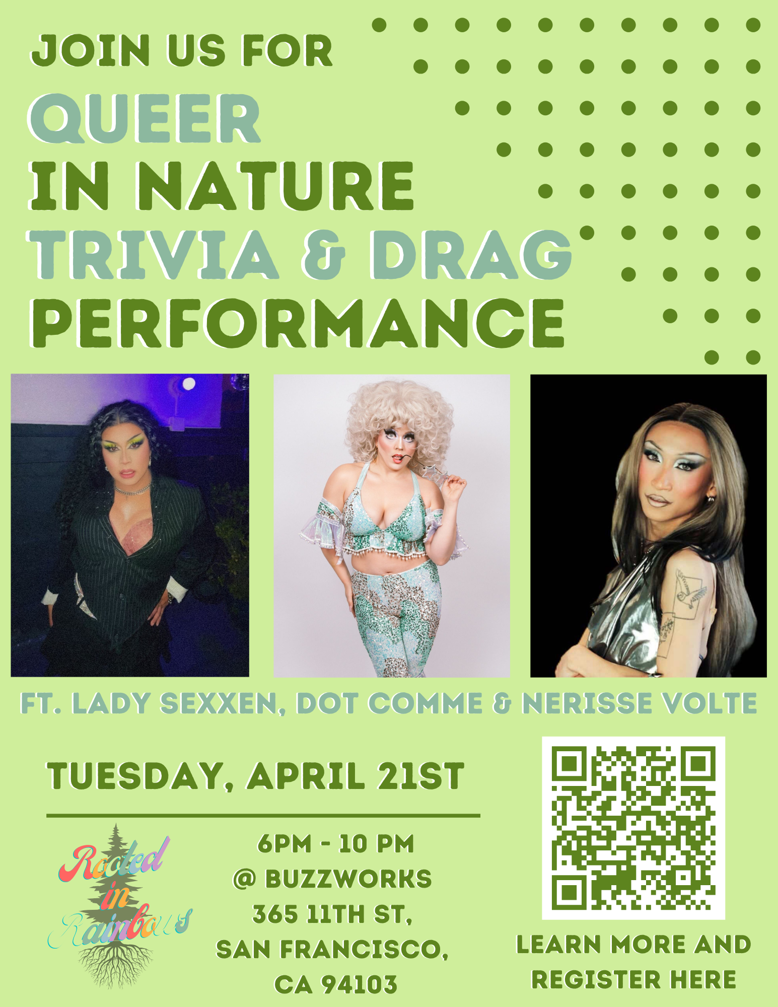 Queer in Nature: Trivia and Drag by Rooted In Rainbows is a independent taking place on Wednesday, April 22, 2026 at BuzzWorks, 365 11th St, San Francisco, CA 94103, USA, San Francisco, United States. This independent is organised by Rooted In Rainbows Events. This event is check the event page for pricing details. Currently 7 people have registered out of 7 spots. The event runs for approximately 3 hours and 30 minutes.