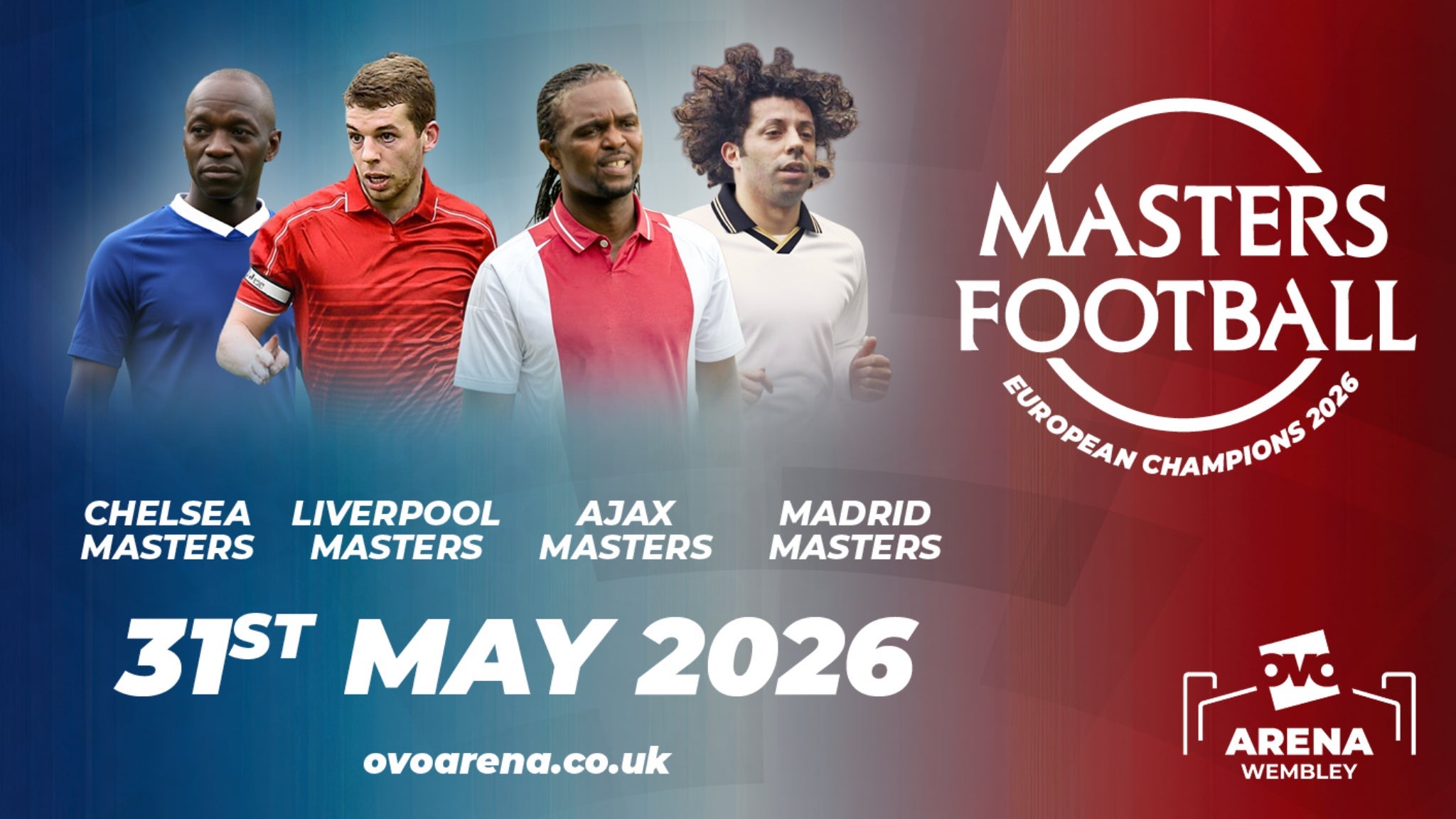Masters Football European Champions 2026 - Venue Premium Tickets is a Soccer taking place on Sunday, May 31, 2026 at OVO Arena Wembley, London, GB. This Soccer is organised by MASTERS GLOBAL SPORTS LTD. This event is check the event page for pricing details.