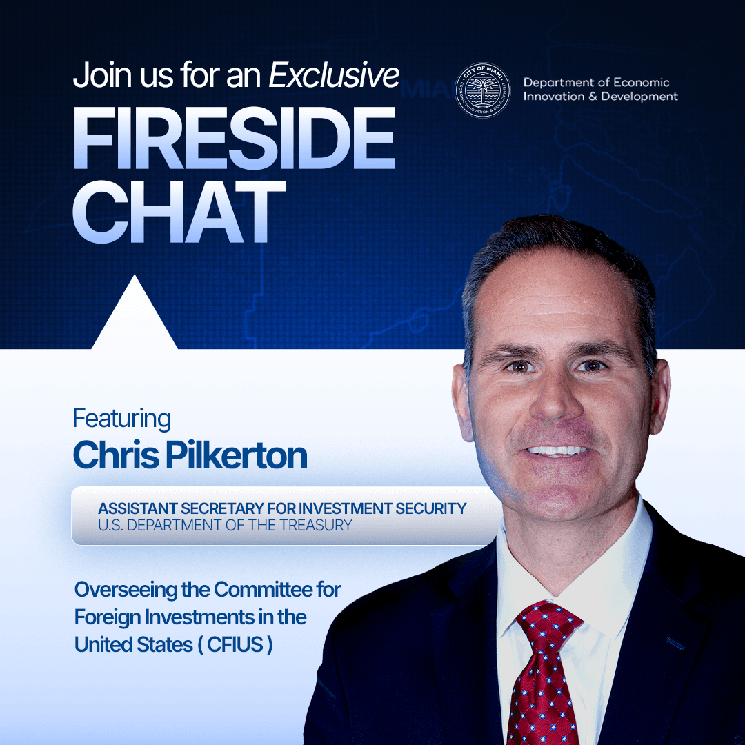 As global capital flows continue to shape markets, infrastructure, and innovation, understanding the national security framework governing foreign investment has never been more important. The City of Miami’s Department of Economic Innovation and Development will host a special briefing with Chris Pilkerton, Assistant Secretary for Investment Security at the U.S. Department of the Treasury, who oversees the Committee on Foreign Investment in the United States (CFIUS) and the Outbound Investment Security Program.