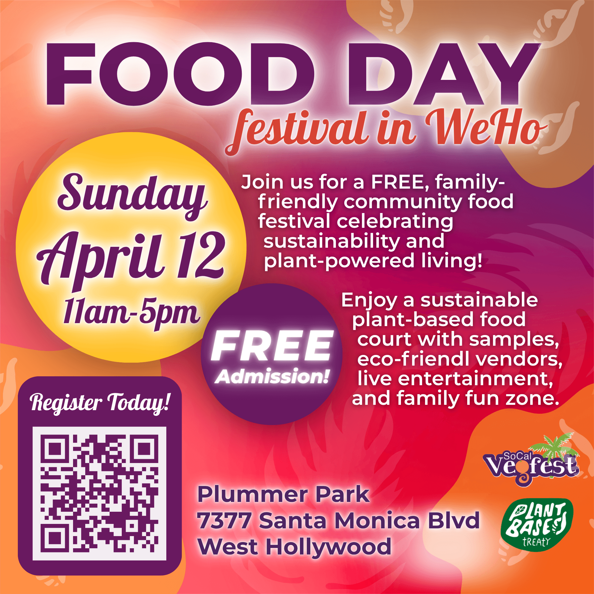 Food Day Festival is hosted by Plant Based Treaty, a global initiative urging cities, institutions, and communities to adopt plant-based food systems as a frontline climate solution — alongside SoCal Vegfest and the City of West Hollywood as part of a public information campaign connecting food choices with climate action.Sunday, April 12, 202611:00 AM – 5:00 PMPlummer Park, 7377 Santa Monica Blvd, West HollywoodFREE AdmissionThis is a space where climate action is delicious, inclusive, and community-powered — For the Community, by the Community.FIESTA HALL — MAIN STAGE PROGRAMMING• "A Thriving Food System for All: An Interactive Simulation" presented by Climate Interactive, En-ROADS Climate Simulator• Fireside Chat on local food policy, LA28 Olympic sustainability, and the road to a just food future• "Climate Hot Ones" — elected officials tackle climate questions live on stage while eating spicy chick'un wings!OUTDOOR & PARK-WIDE ACTIVITIES• 40+ delicious plant-based food pop-ups, food trucks, eco-vendors and non-profit organizations• Free food sampling at Fiesta Hall courtyard 12–3 PM• Live music and comedy at the Leaf it Loud Stage• Planet Heroes Family Fun Zone• Prize giveaways and community networking Register here (FREE): http://fooddayfestival.eventbrite.com/