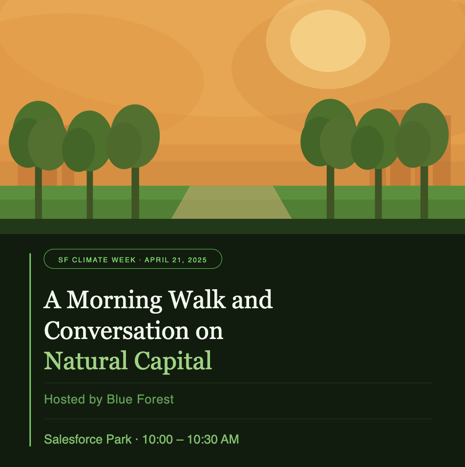 Blue Forest has spent the past decade pioneering conservation finance, building the funding structures that make large-scale forest restoration possible across the country. As wildfire seasons grow longer and more destructive, the urgency to scale proactive forest restoration has never been greater. This walk is a chance to hear directly from the Blue Forest team about how they're tackling that challenge through financial innovation, and to connect with fellow investors, practitioners, and climate professionals who are thinking about the same problems.