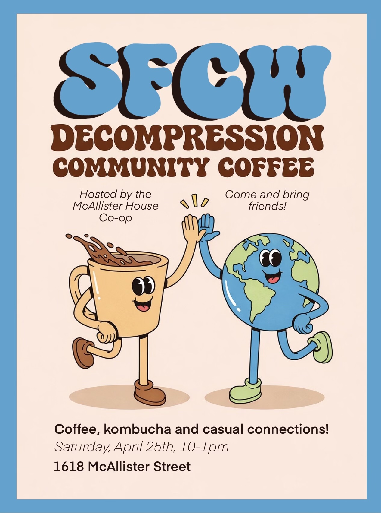 SFCW Decompress: Coffee & Community is a free independent taking place on Saturday, April 25, 2026 at San Francisco. Attendance is free — register to secure your spot. The event runs for approximately 3 hours.