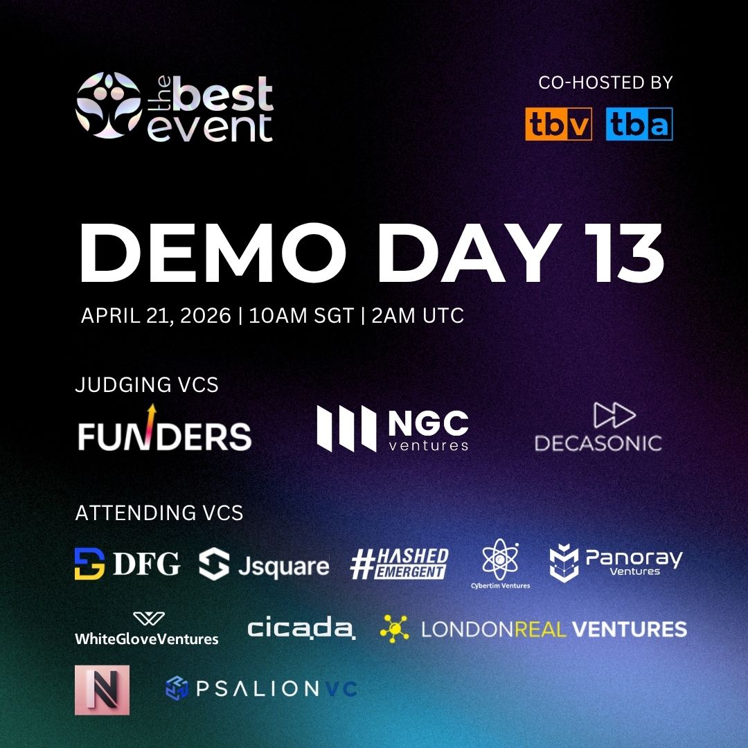 Join us at the TBV Demo Day #13, where selected crypto and web3 founders will be under the pump to pitch their projects in 2 minutes. If you’re a blockchain and web3 investor short on time and want to see fantastic and diverse projects across many sectors in 60 minutes, this event is for you!