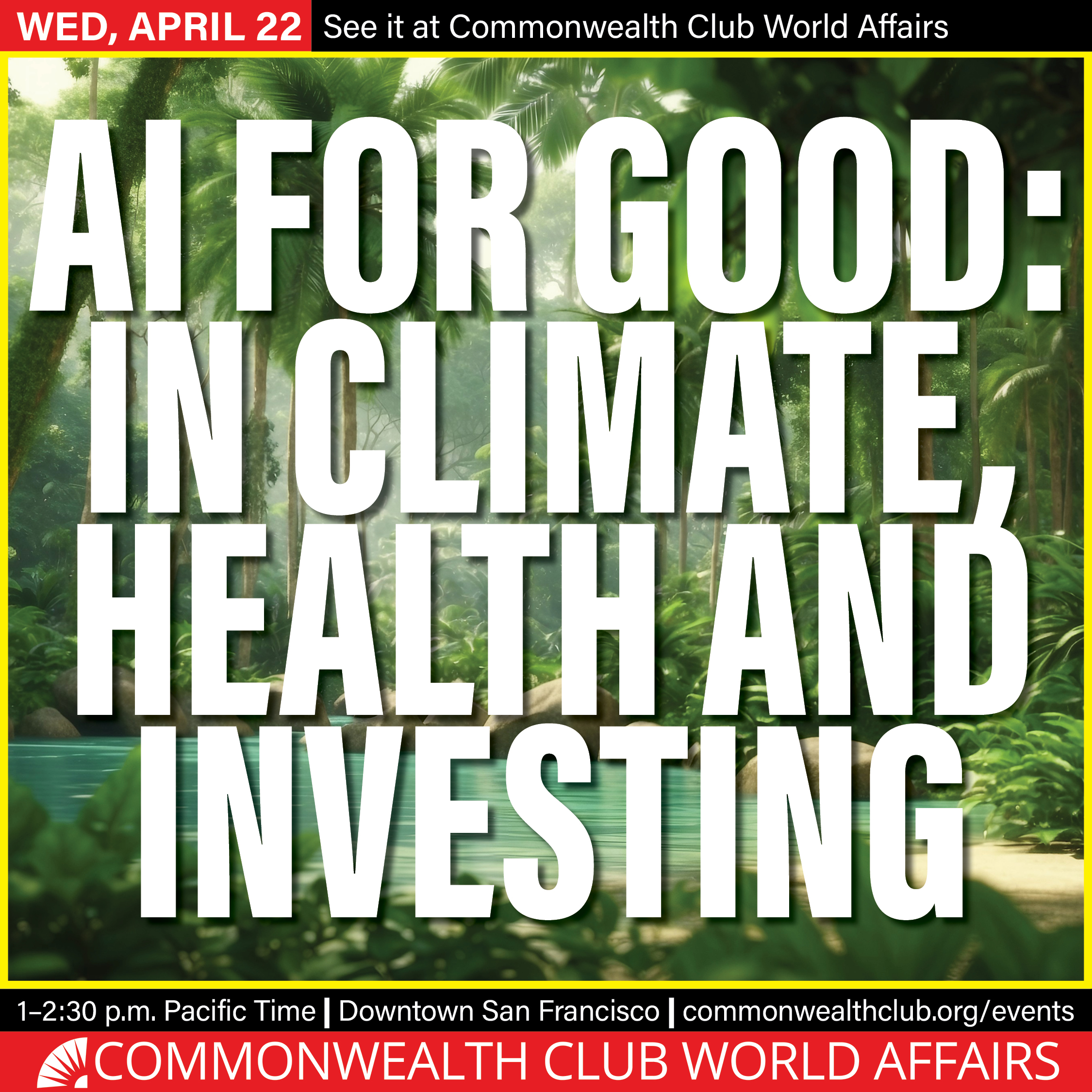 AI for Good: In Climate, Health and Investing is a independent taking place on Wednesday, April 22, 2026 at 110 The Embarcadero, San Francisco, CA 94105, USA, San Francisco, United States. This independent is organised by Commonwealth Club World Affairs. This event is priced up to usd 27.5. Currently 144 people have registered out of 144 spots. The event runs for approximately 1 hour and 30 minutes.