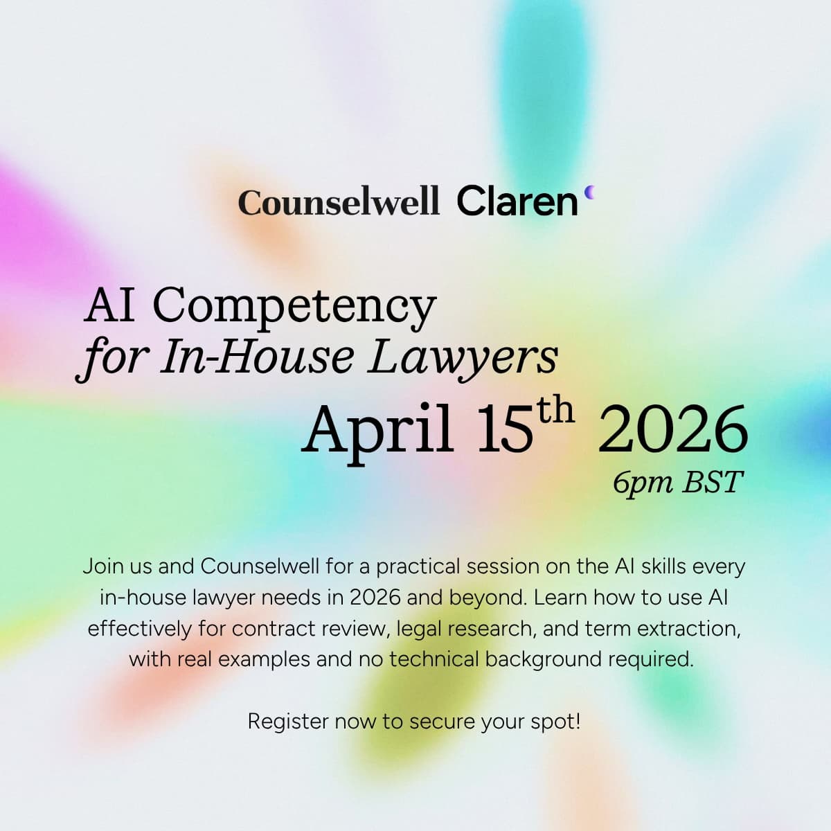 Join Claren AI and CounselWell for a practical session on the AI skills every in-house lawyer needs in 2025 and beyond. Learn how to use AI effectively for contract review, legal research, and term extraction, with real examples and no technical background required.