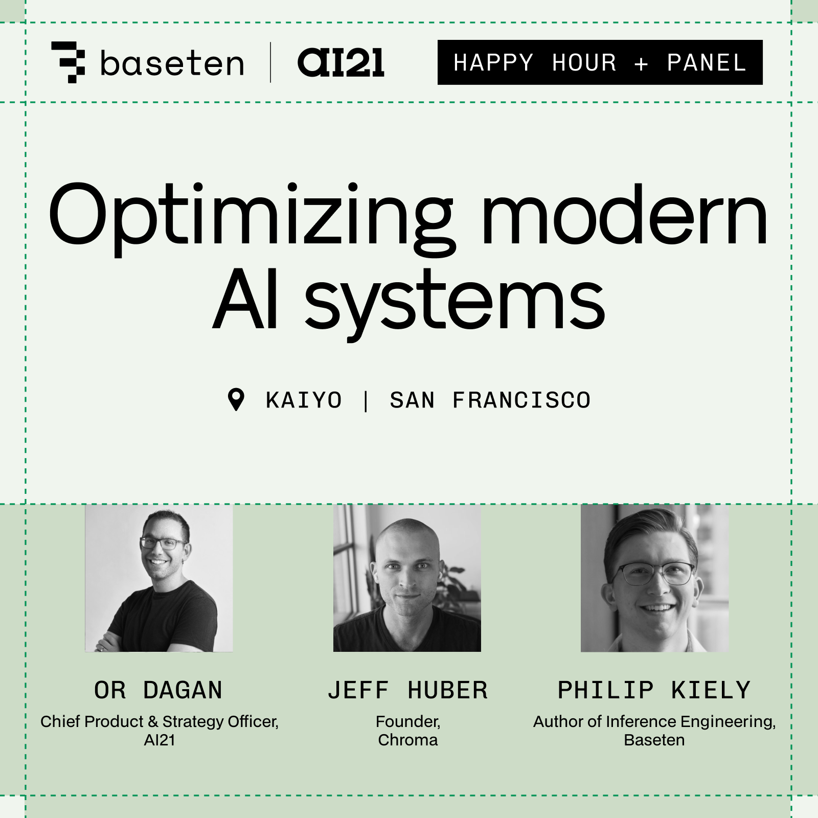 Optimizing Modern AI Systems is a free independent taking place on Wednesday, April 29, 2026 at KAIYŌ Restaurant, 701 3rd St 1st Floor, San Francisco, CA 94107, USA, San Francisco, United States. This independent is organised by Baseten Events. Attendance is free — register to secure your spot. The event runs for approximately 2 hours and 30 minutes.