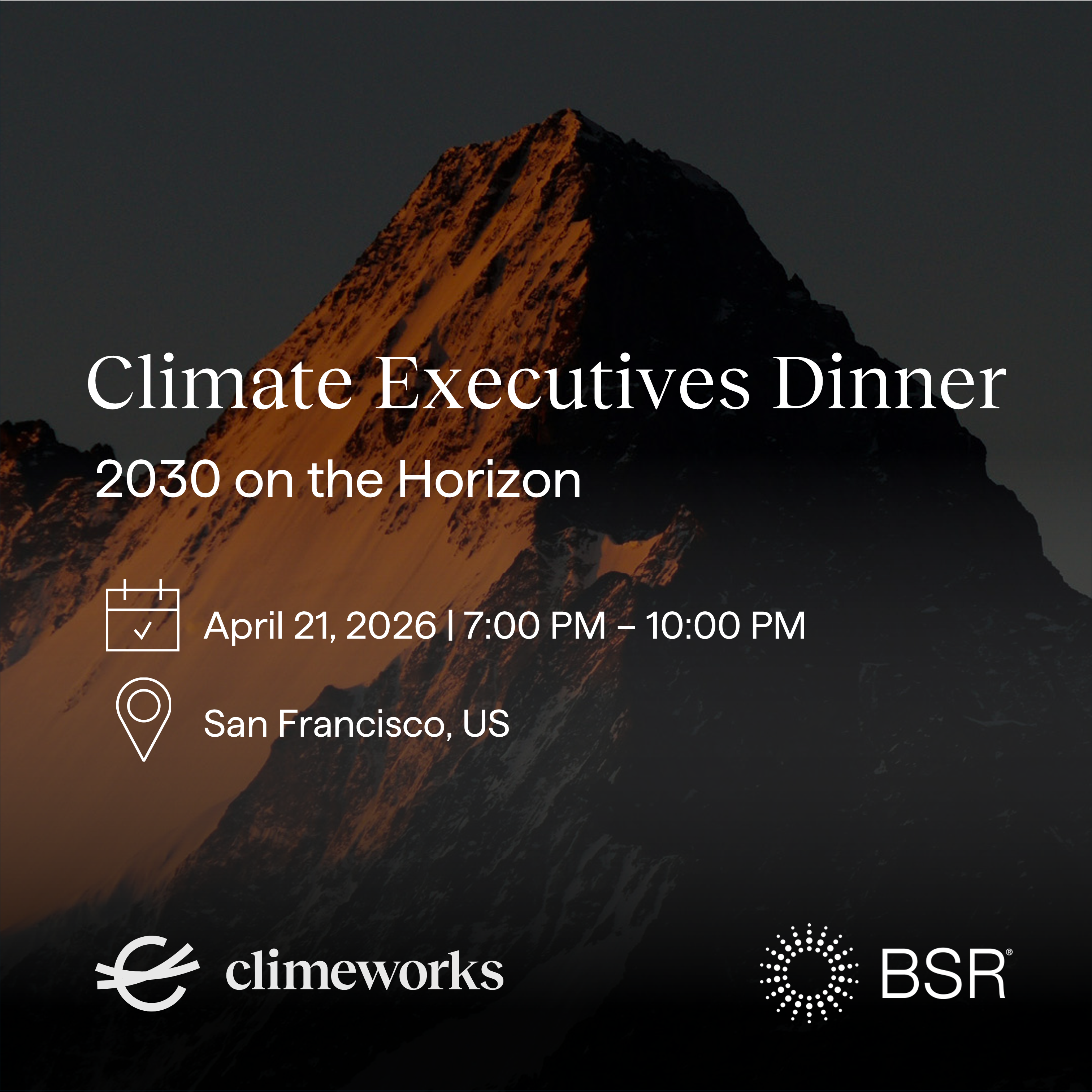 BSR and Climeworks invite you to an executive‑level gathering during San Francisco Climate Week: the Climate Executives Dinner: 2030 on the Horizon, taking place on April 21, 2026, from 7:00 PM to 10:00 PM in San Francisco.