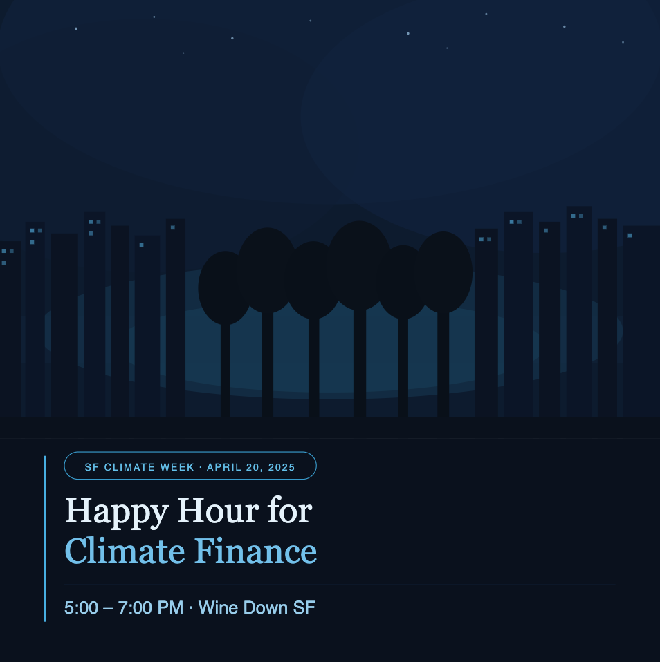 Happy Hour for Climate Finance covers topics including Climate, Food & Drink, SF Climate Week 2026. Find similar events by browsing these topics on Rifio.