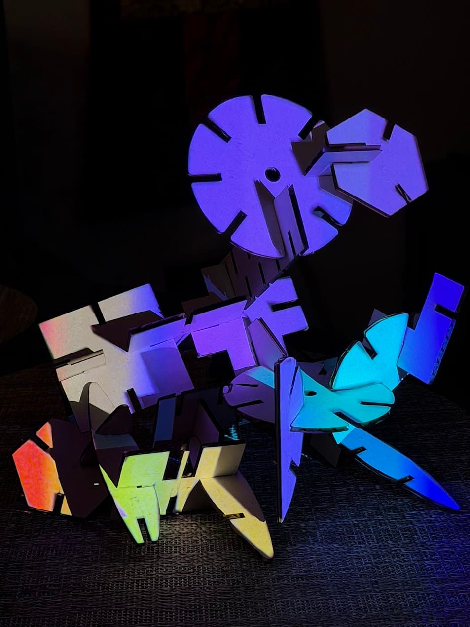 4:15–5:00 — Share-Out & Closing Each participant briefly shares their sculpture — what worked, what surprised them. Group discussion on the relationship between physical making and projected light. Documentation photos taken of each finished piece. Take your construction set home and keep building.