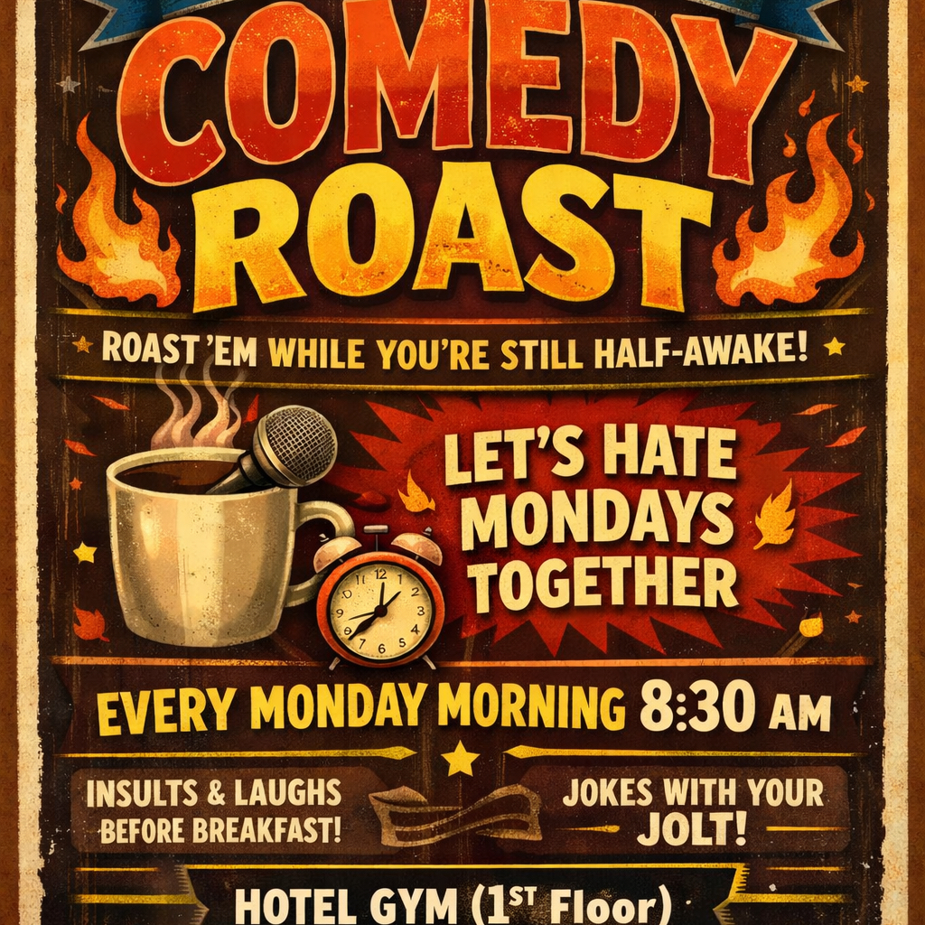Monday ROAST club is a free independent taking place on Monday, April 20, 2026 at Hotel Gym (1st Floor). Attendance is free β register to secure your spot. The event runs for approximately 1 hour.