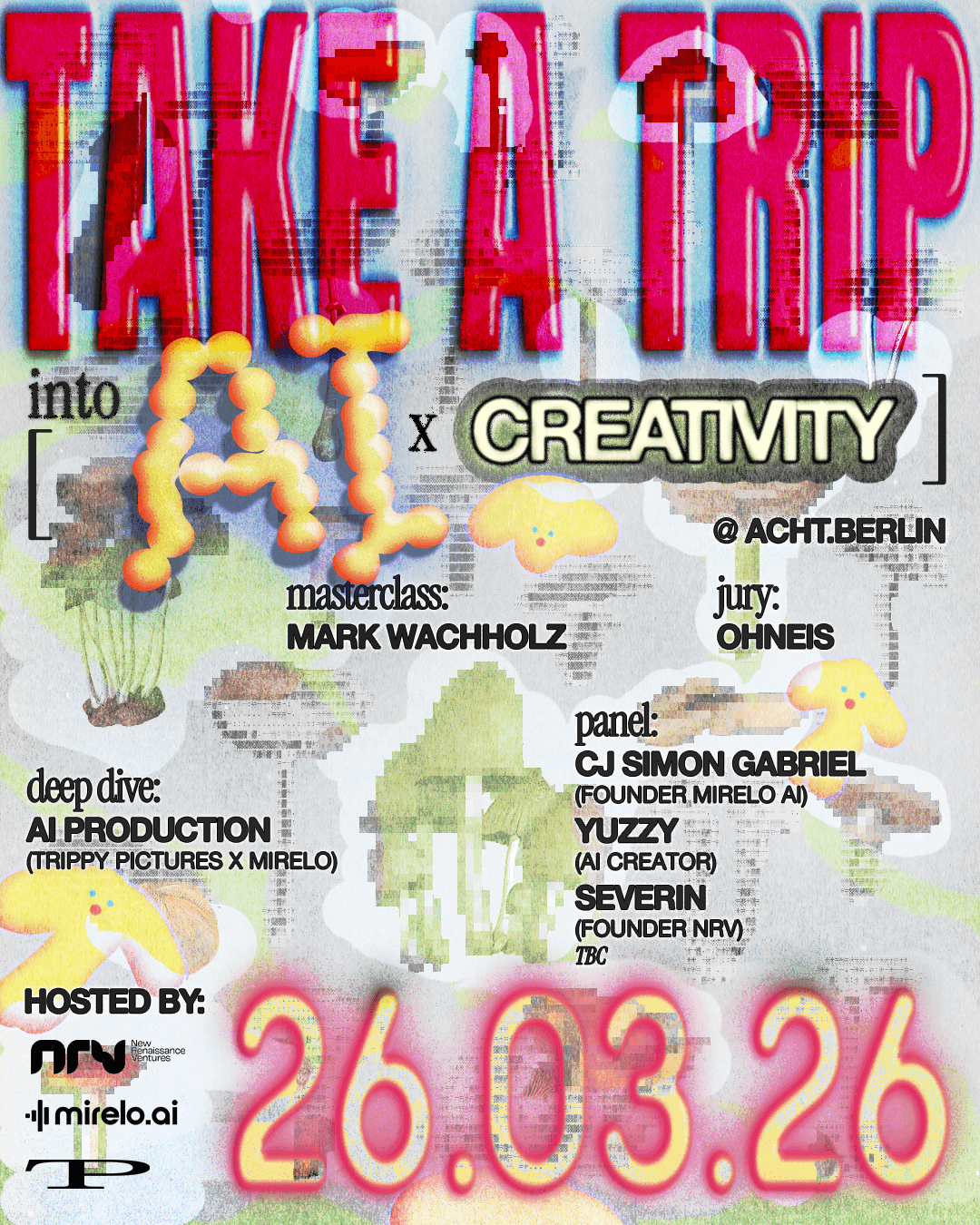 Mirelo AI, New Renaissance Ventures, and Trippy Pictures are bringing together the most forward-thinking minds in AI and creative production for an evening at Acht Kino Berlin. Part panel, part live case study, part community.