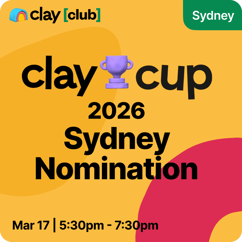🗳️ Attendees — You are the jury! After watching the demos, you'll be able to vote for your favourite candidate. The winner becomes Sydney' official Clay Cup 2026 nominee and advances to the global competition.