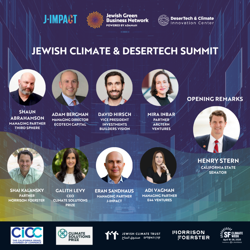 Jewish Green Business Network, powered by Adamah, J-Impact and The DeserTech & Climate Innovation Center invite you to join a curated networking event during San Francisco Climate Week.On Earth Day, we are bringing together leading investors, founders, corporates and ecosystem leaders with a selected group of cutting-edge Israeli energy, water and agriculture startups.