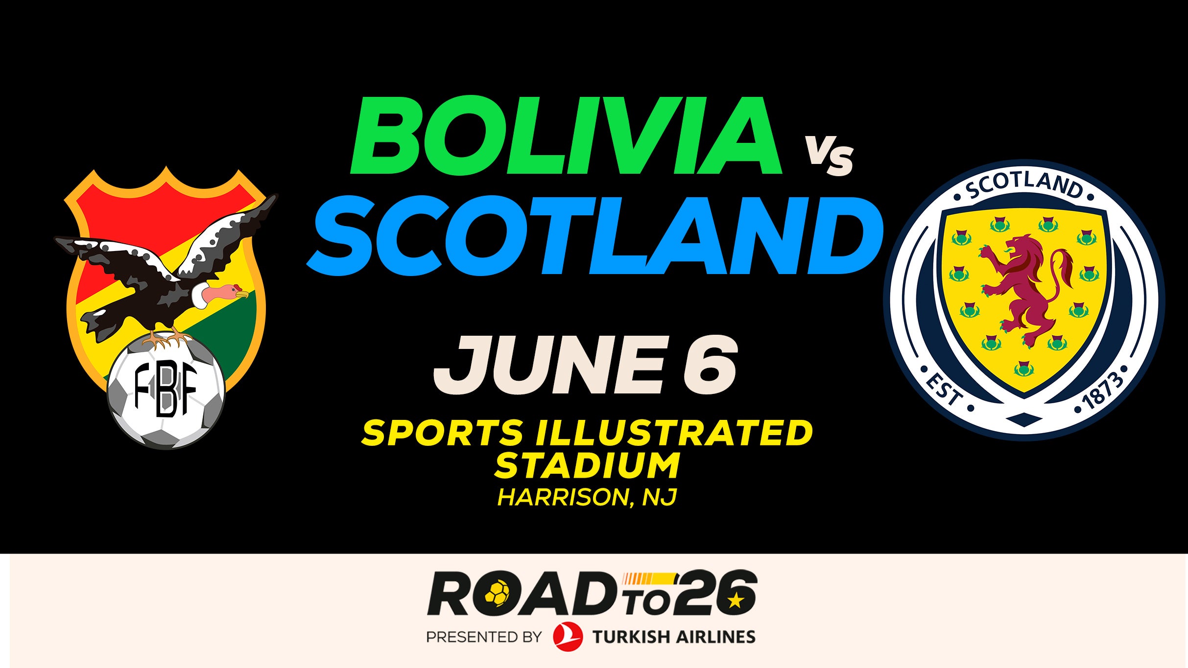 Road to 26: Bolivia v. Scotland is a Soccer taking place on Saturday, June 6, 2026 at Sports Illustrated Stadium, Harrison, US. This Soccer is organised by PROMOTED BY VENUE. This event is check the event page for pricing details.
