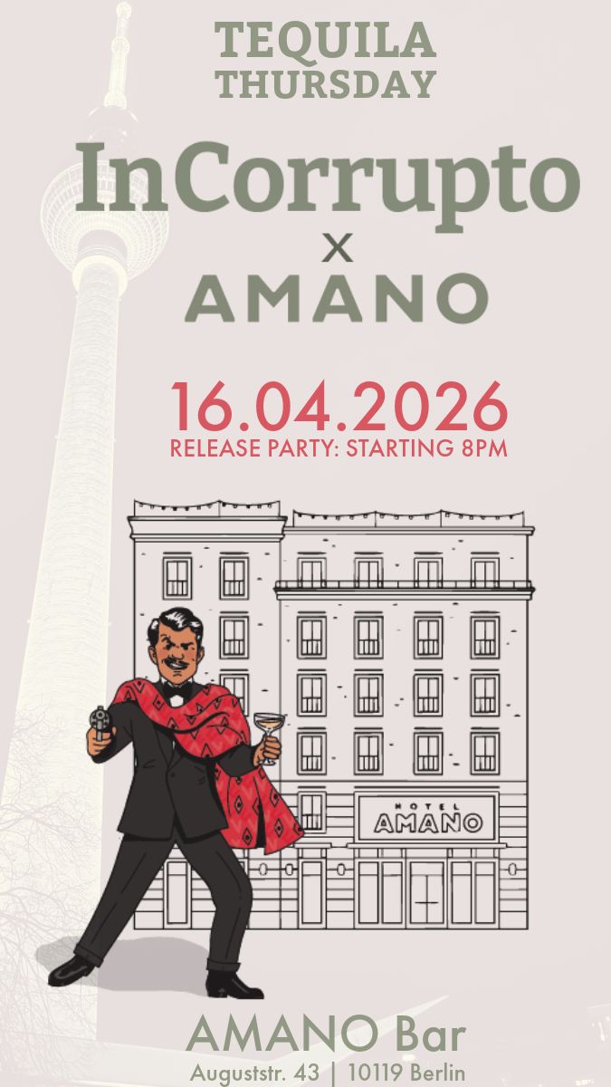 - InCorrupto Tequila x AMANO - Limited Edition Launch Party takes place on Thursday, April 16, 2026 from 6:00 PM to 12:00 AM (Europe/Berlin).