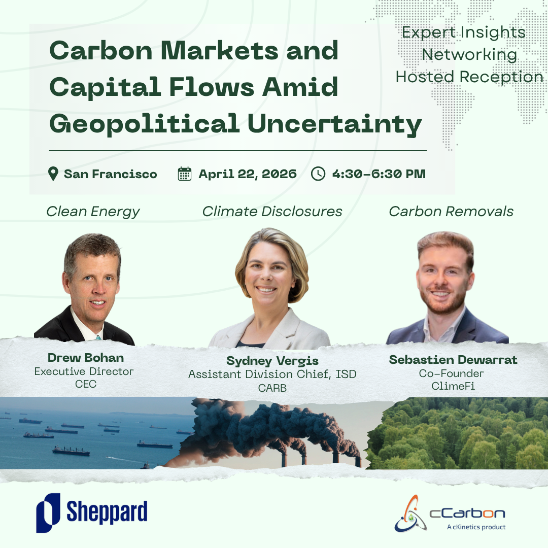 This gathering will convene select leaders across carbon markets, clean fuels, finance, and policy to discuss how geopolitical uncertainty is reshaping market signals, policy direction, and capital allocation. Fittingly taking place on Earth Day, the conversation will span both compliance markets, including cap-and-invest systems and low-carbon fuel standards, as well as capital flows into carbon projects driven by voluntary and corporate demand, with added focus on emerging investment trends in carbon removals. The evening will include expert interventions from Drew Bohan, Executive Director of the California Energy Commission, and Sebastien Dewarrat, Co-Founder of ClimeFi, alongside informal networking and discussion designed to encourage candid exchange. Hosted by cCarbon (a division of cKinetics) and Sheppard. Attendance is subject to confirmation.