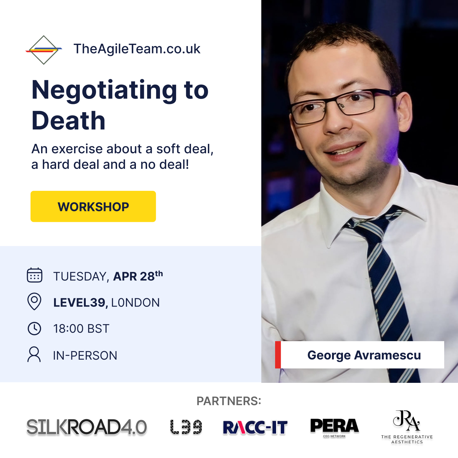Negotiating to Death: An exercise about a soft deal, a hard deal and a no deal! is a independent taking place on Tuesday, April 28, 2026 at London. This independent is organised by TheAgileTeam.co.uk. This event is check the event page for pricing details. The event runs for approximately 2 hours.