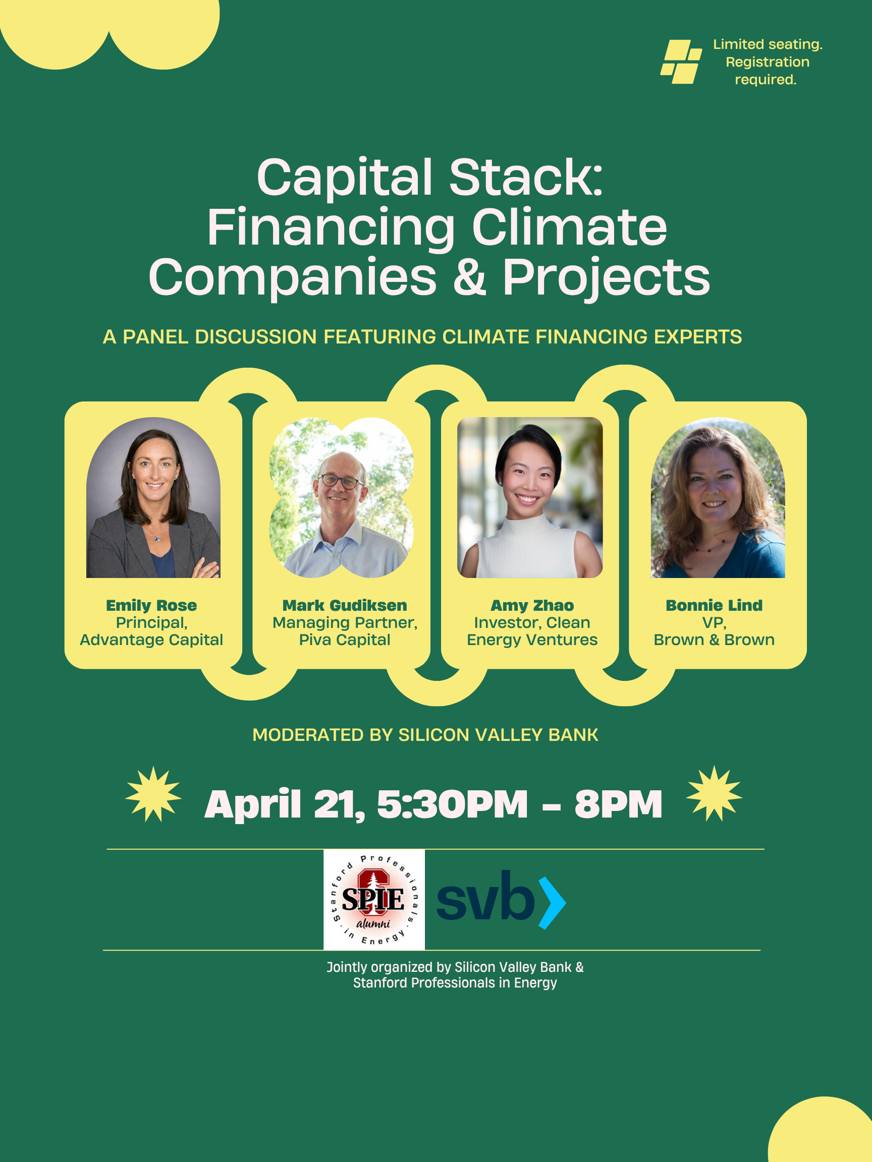 This event is jointly organized by Stanford Professionals in Energy (SPIE) & Silicon Valley Bank (SVB).