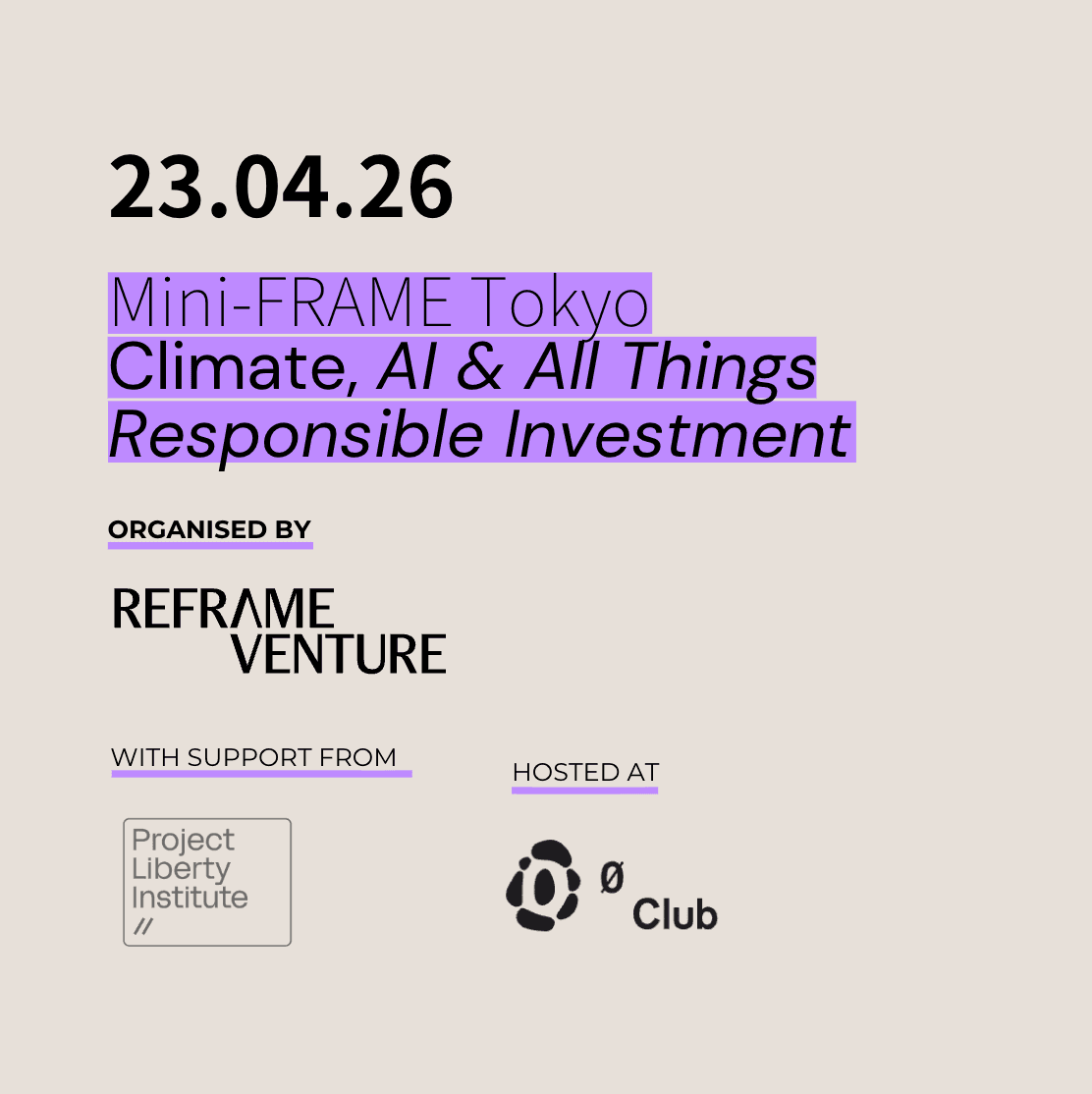 Join us for our first mini-FRAME conference in Tokyo, organised by Reframe Venture on all things Climate, AI and some of 'the rest' of responsible investing, in the afternoon of Thursday April 23. This invite-only, Chatham-House-rule event is for tech private market investors and LPs. We are supported by the Project Liberty Institute and 0 Club (as our kind hosts).