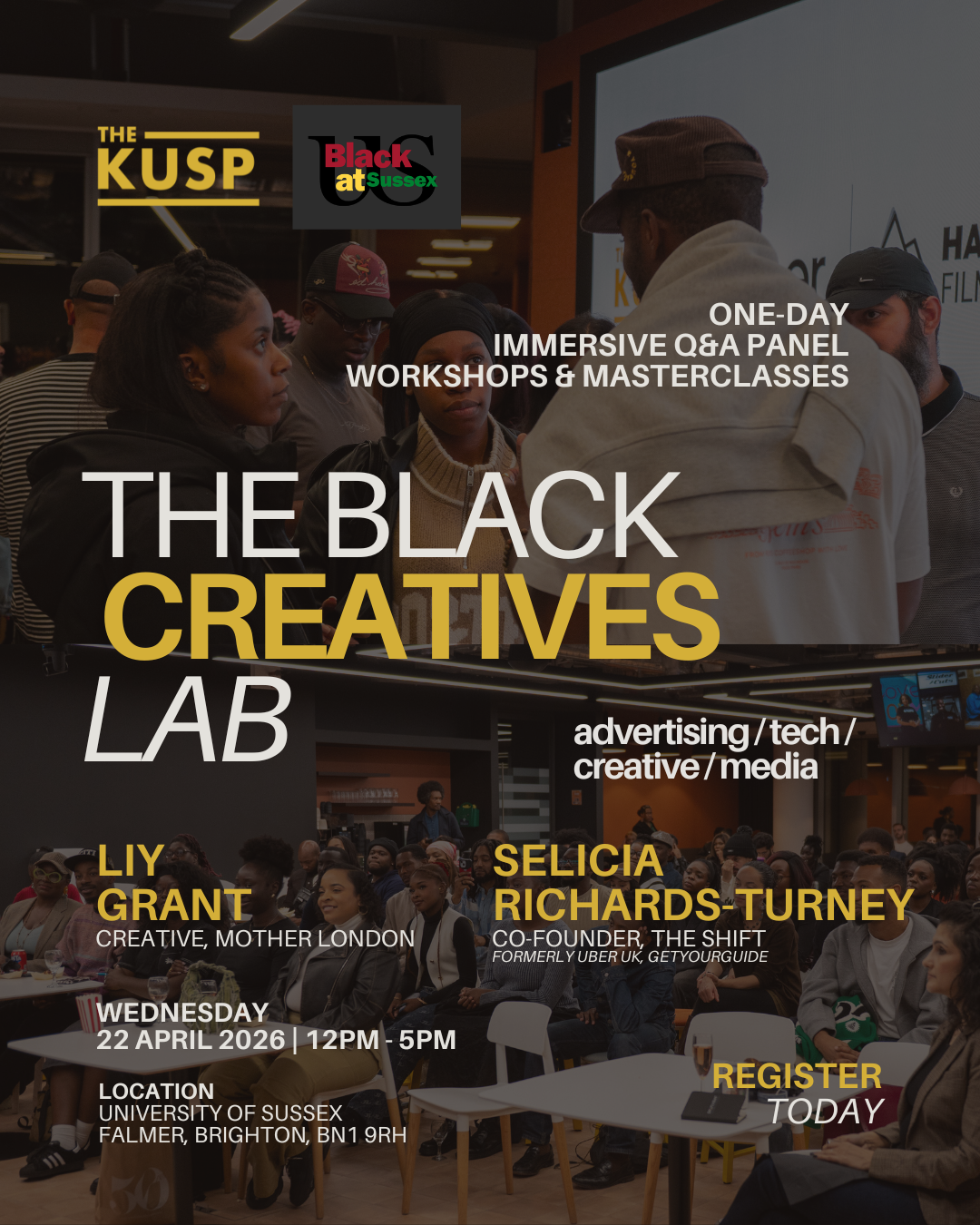 Brought to you by Black at Sussex and The Kusp; The Black Creatives Lab is a one-day immersive experience designed to support, celebrate, and elevate Black students interested in careers across the creative industries.On Wednesday 22nd April 2026 from 12:00pm - 5:00pm on the University of Sussex Campus, what we have planned isn't just another career event. The Black Creatives Lab is a space created for you to connect with industry leaders who look like you, to develop your skills and professional development.